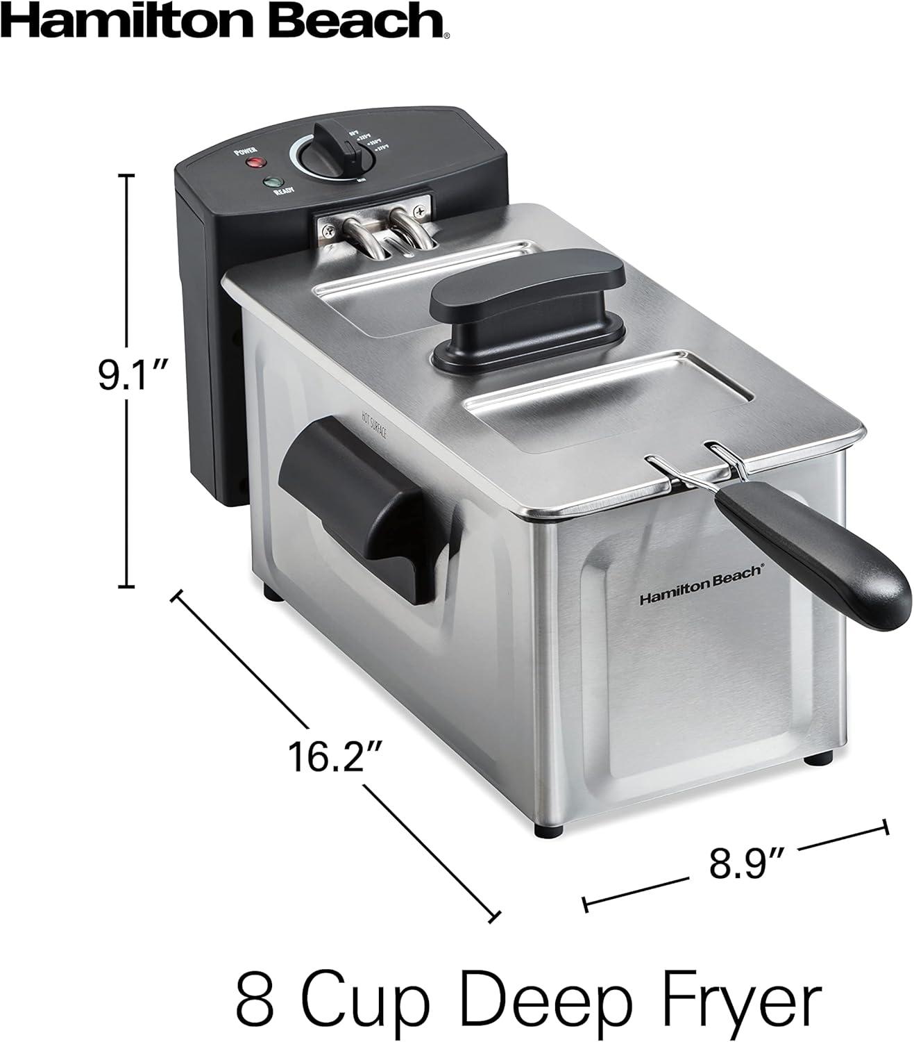 FAMILY-SIZE CAPACITY: This deep fryer with basket has an 8 cup oil capacity, so you can fry up to 6 cups of your favorite food in its chrome-plated frying basket.