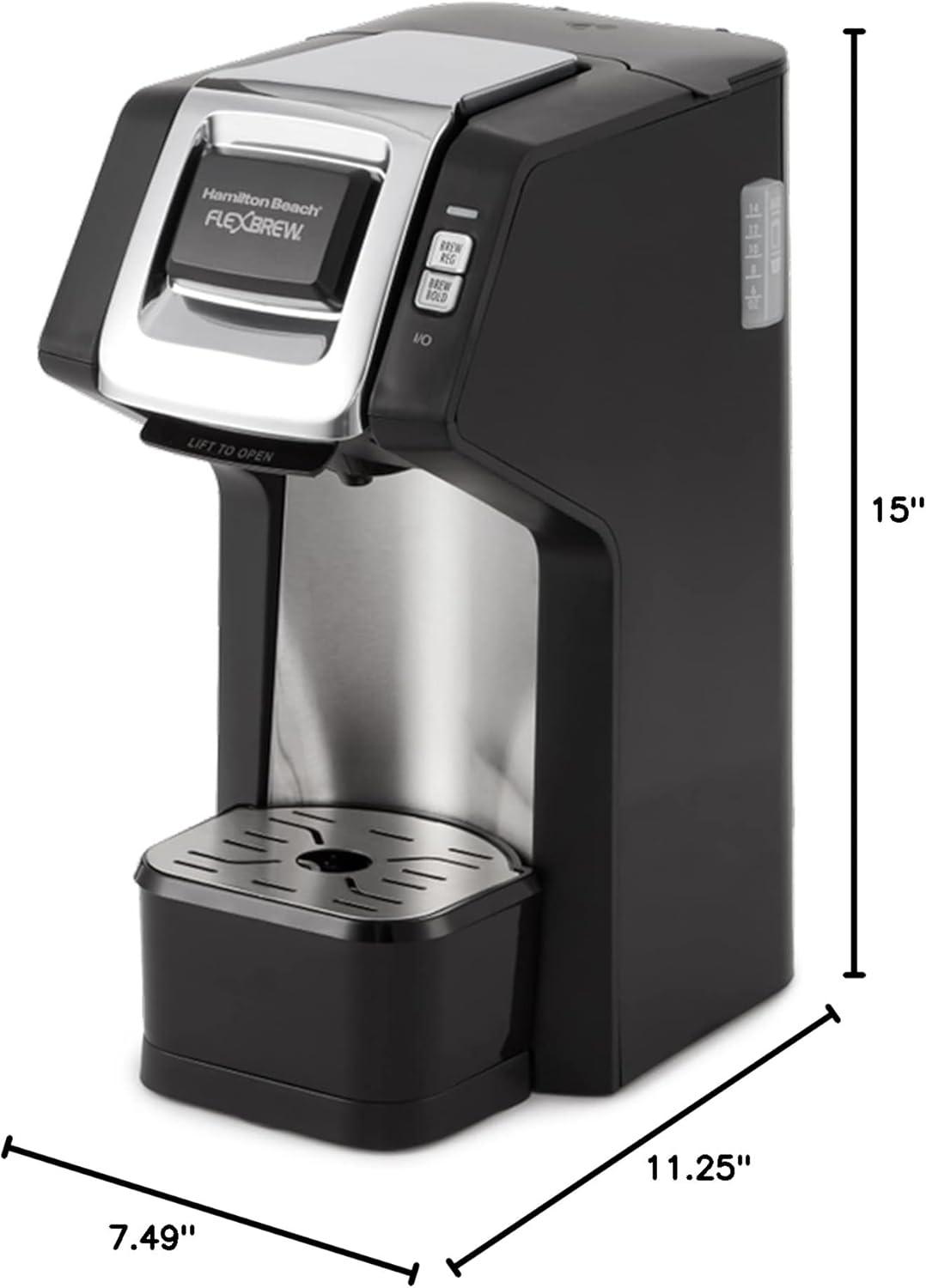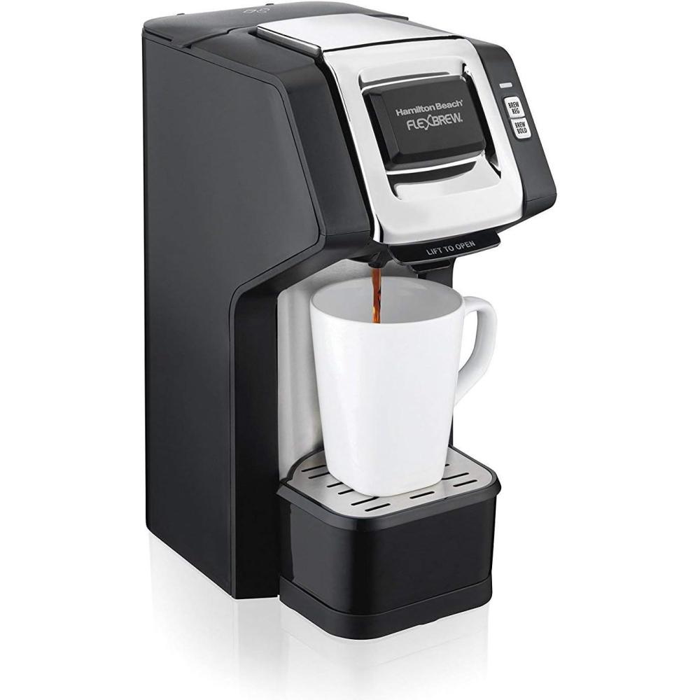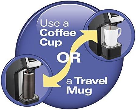 BREW UP TO 10 OZ WITH A SINGLE-SERVE POD OR 14 OZ WITH GROUND COFFEE Easily brew a bigger cup of coffee when you need with this Hamilton Beach coffee maker Fits tall travel mugs to take your coffee on the go