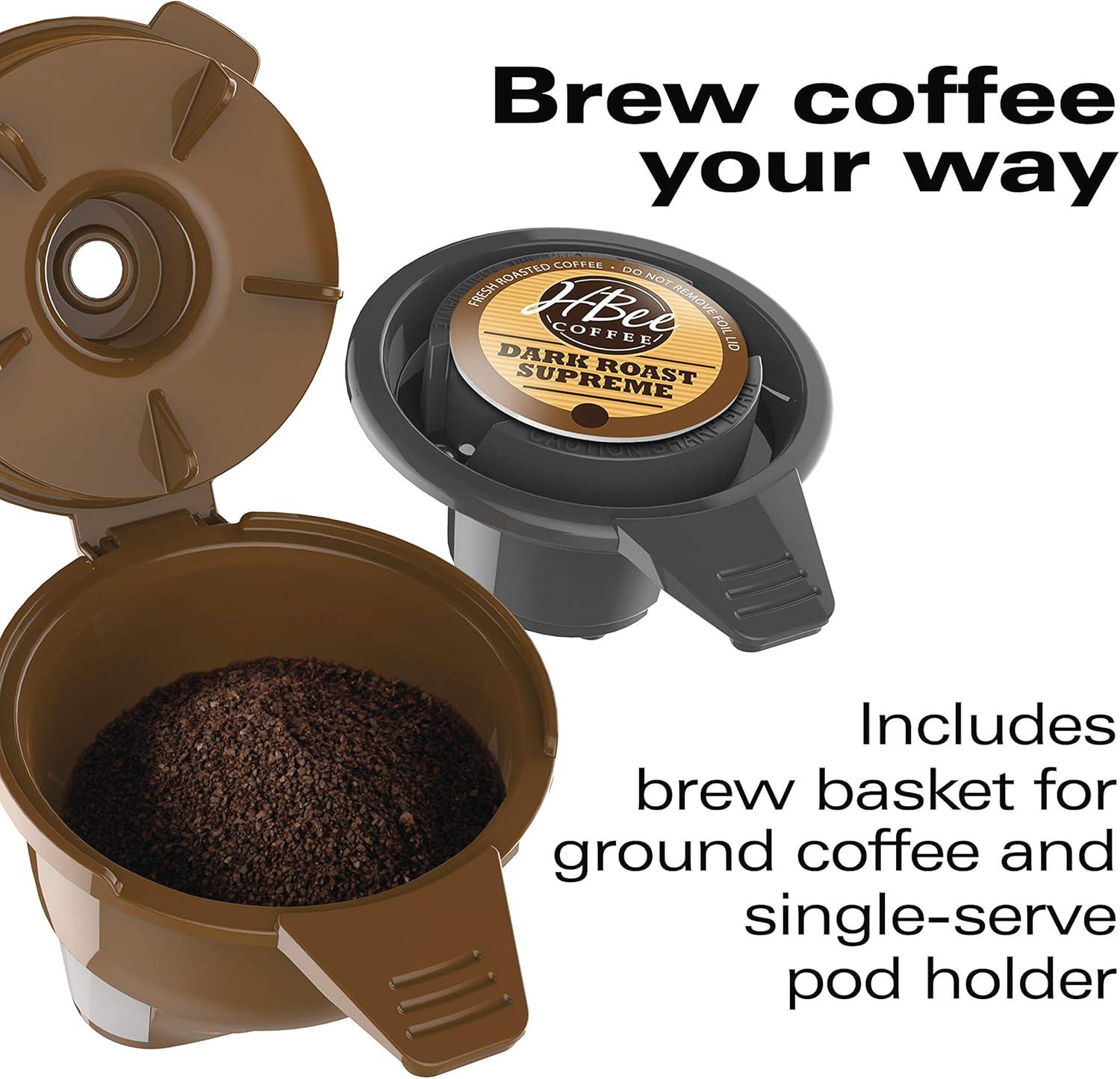 BREW UP TO 10 OZ WITH A SINGLE-SERVE POD OR 14 OZ WITH GROUND COFFEE Easily brew a bigger cup of coffee when you need with this Hamilton Beach coffee maker Fits tall travel mugs to take your coffee on the go