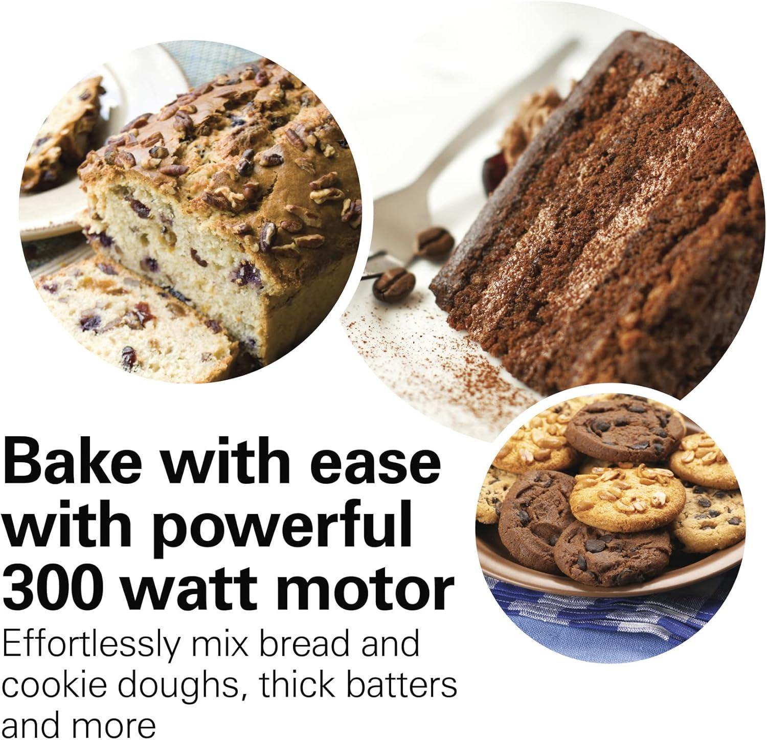 BAKE WITH EASE: Effortlessly mix thick batters and doughs for bread, cookies and more. With a 300 watt motor, this Hamilton Beach stand mixer will easily handle the ingredients for all your homemade baked goods from cupcakes and cookies to hearty bread.