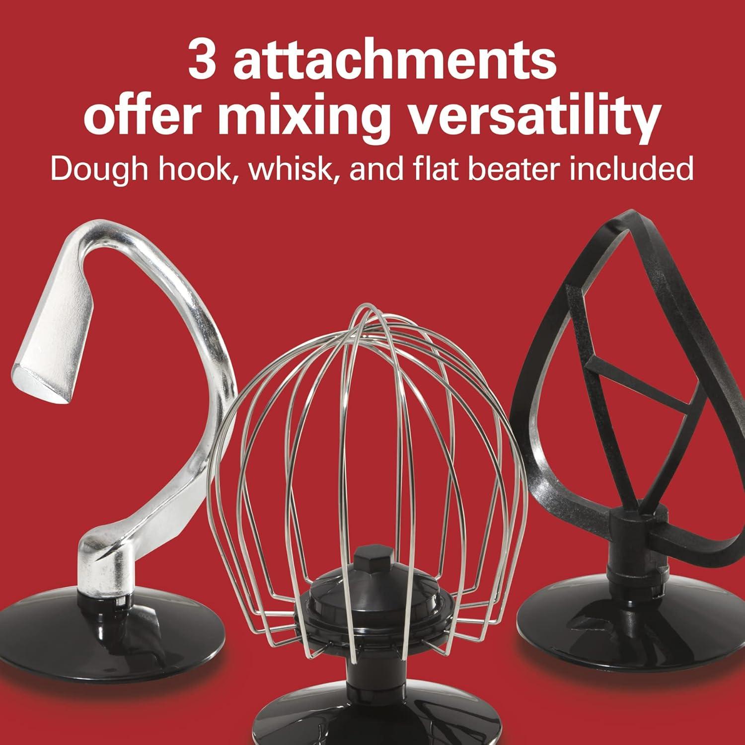 PROVIDES MIXING VERSATILITY: With 3 stand mixer attachments, this versatile stand mixer can handle any mixing job. It includes a dough hook for making bread, whisk for whipping cream or meringue, and a flat beater for mixing a variety of ingredients.