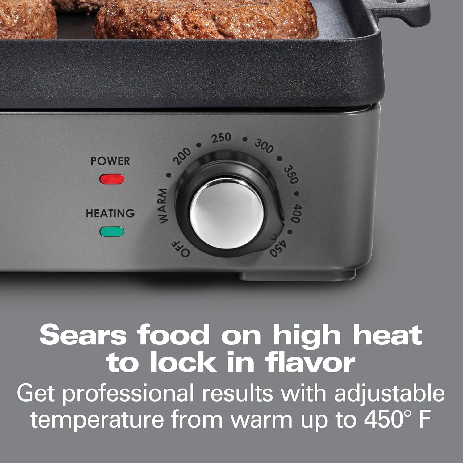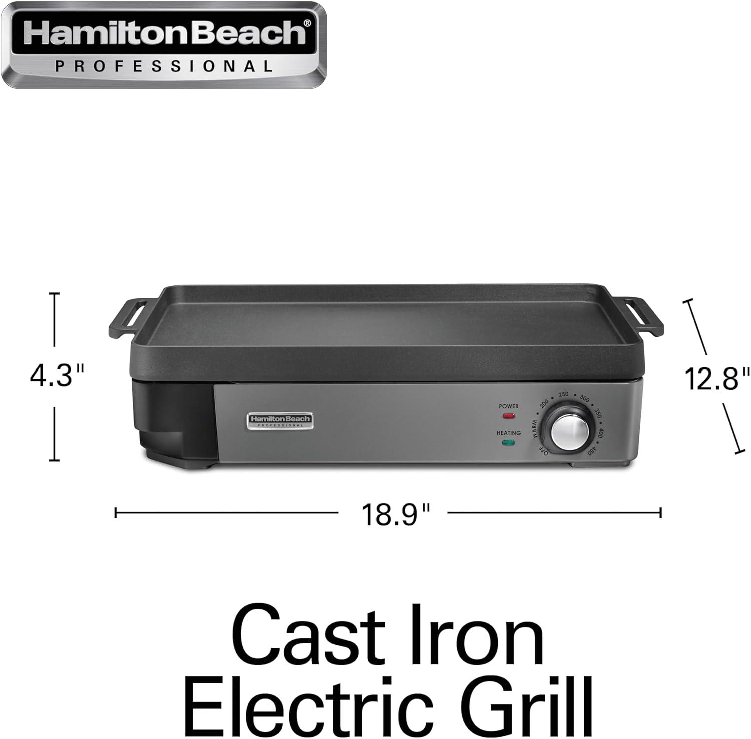 Hamilton Beach Professional Cast Iron Indoor Electric Grill & Griddle, 10″ x 16″ Preseasoned Cooking Surface, Adjustable Temperature up to 450° F, Black (38560)