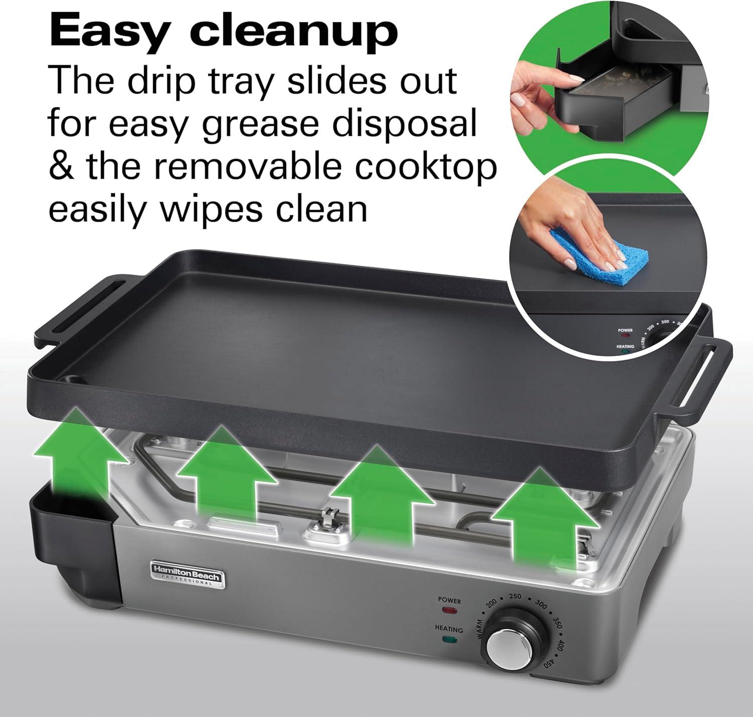 EASY CLEANUP: Easily push grease through the drain into the removable drip tray for disposal or recycling. The drip tray is top-rack dishwasher safe and the cooktop removes from the base to easily wipe clean.