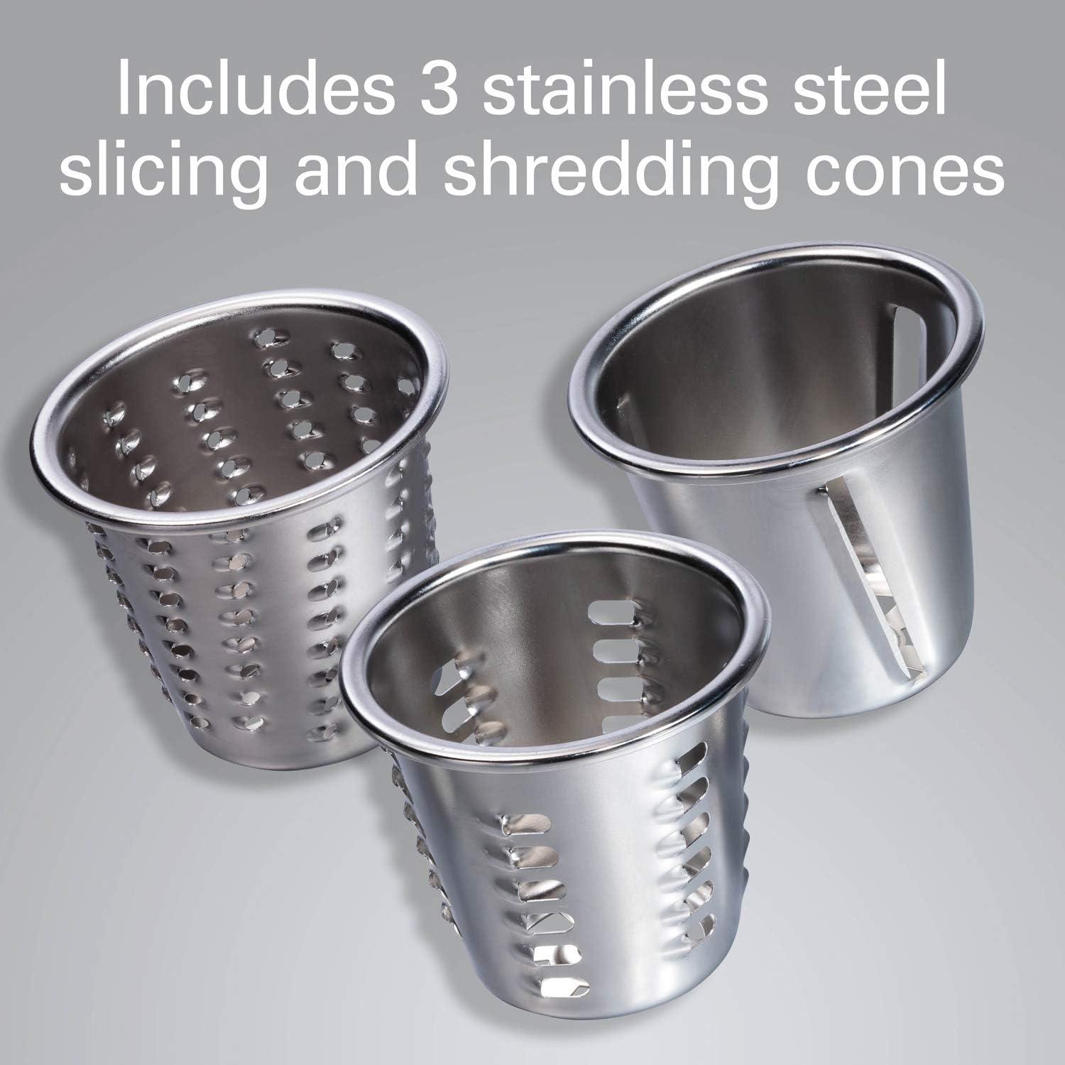 INCLUDES 3 STAINLESS STEEL SLICING AND SHREDDING BLADES: Use the slicing blade to quickly and evenly slice fruit and vegetables such as tomatoes or peppers. The medium and coarse shredding blades are perfect for shredding cheese, cabbage, carrots and more.