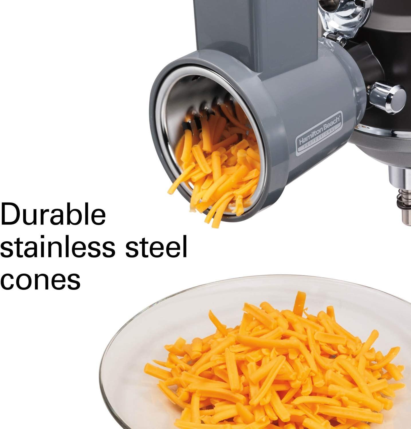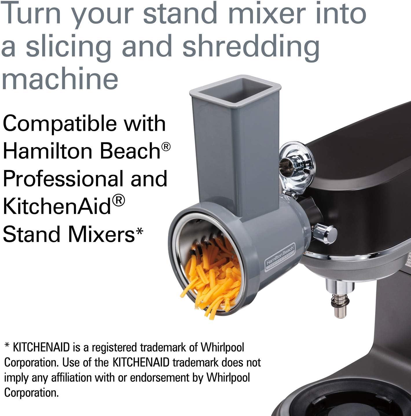 TURN YOUR STAND MIXER INTO A SLICING AND SHREDDING MACHINE. The Hamilton Beach Professional Stand Mixer is easily converted into a slicing and shredding machine by locking this attachment onto the power hub.