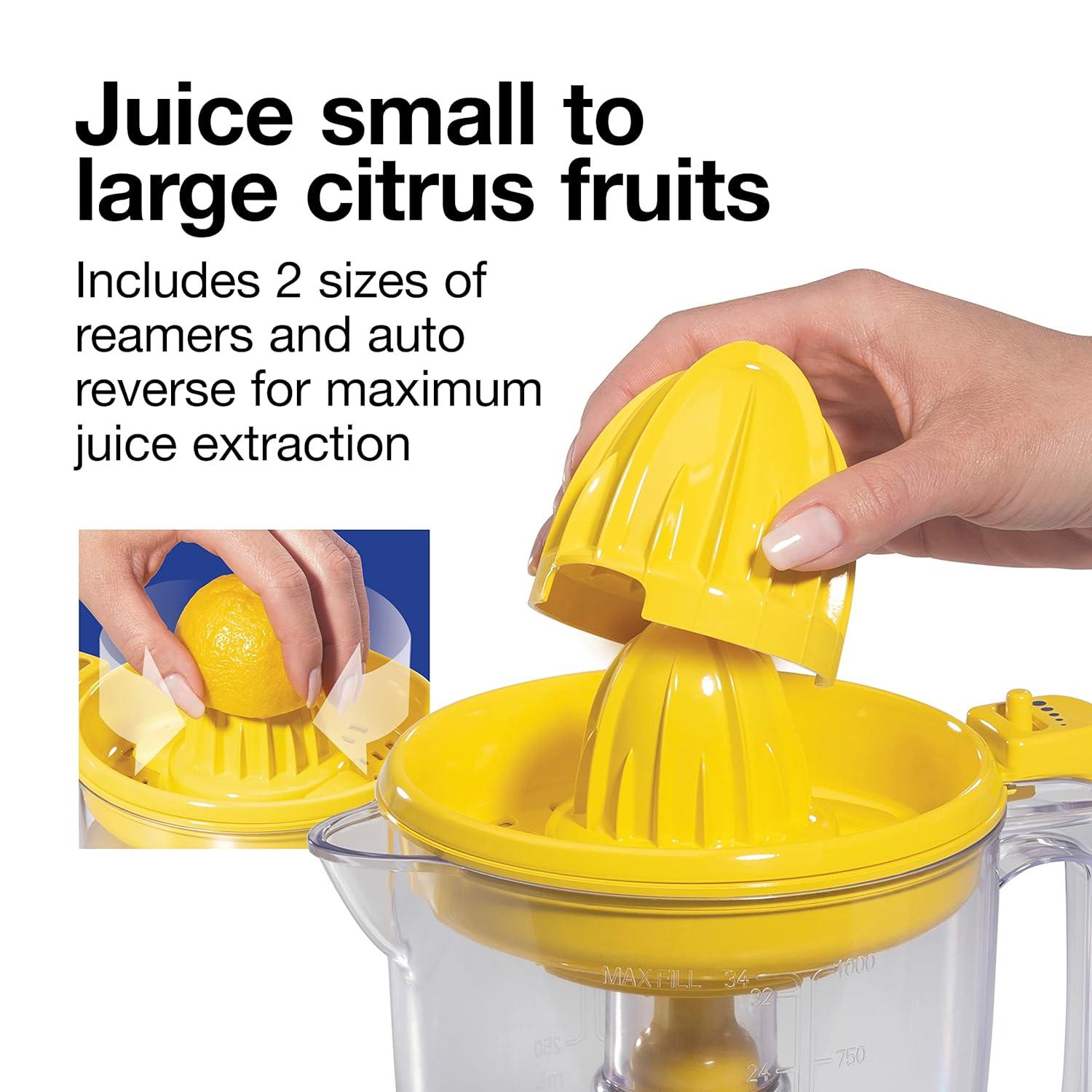 JUICE SMALL TO LARGE FRUITS : The electric citrus juicer squeezer includes 2 nesting reamers for small to large citrus fruit. Juice everything from tiny Key limes to grapefruit. The juicer automatically reverses when needed for maximum juice extraction.
