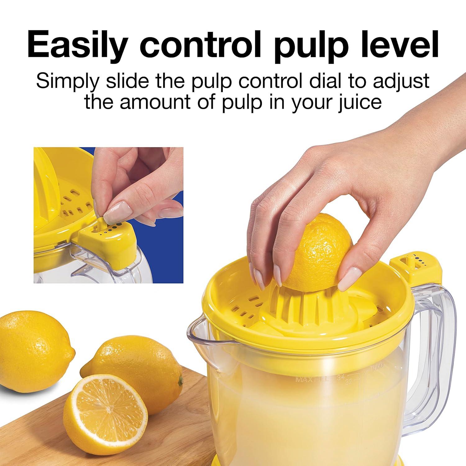 EASILY CONTROL PULP LEVEL: Enjoy the right amount of pulp in your juice by simply sliding the pulp control dial on the lemon juicer left or right. Pulp collects in the strainer to easily discard.