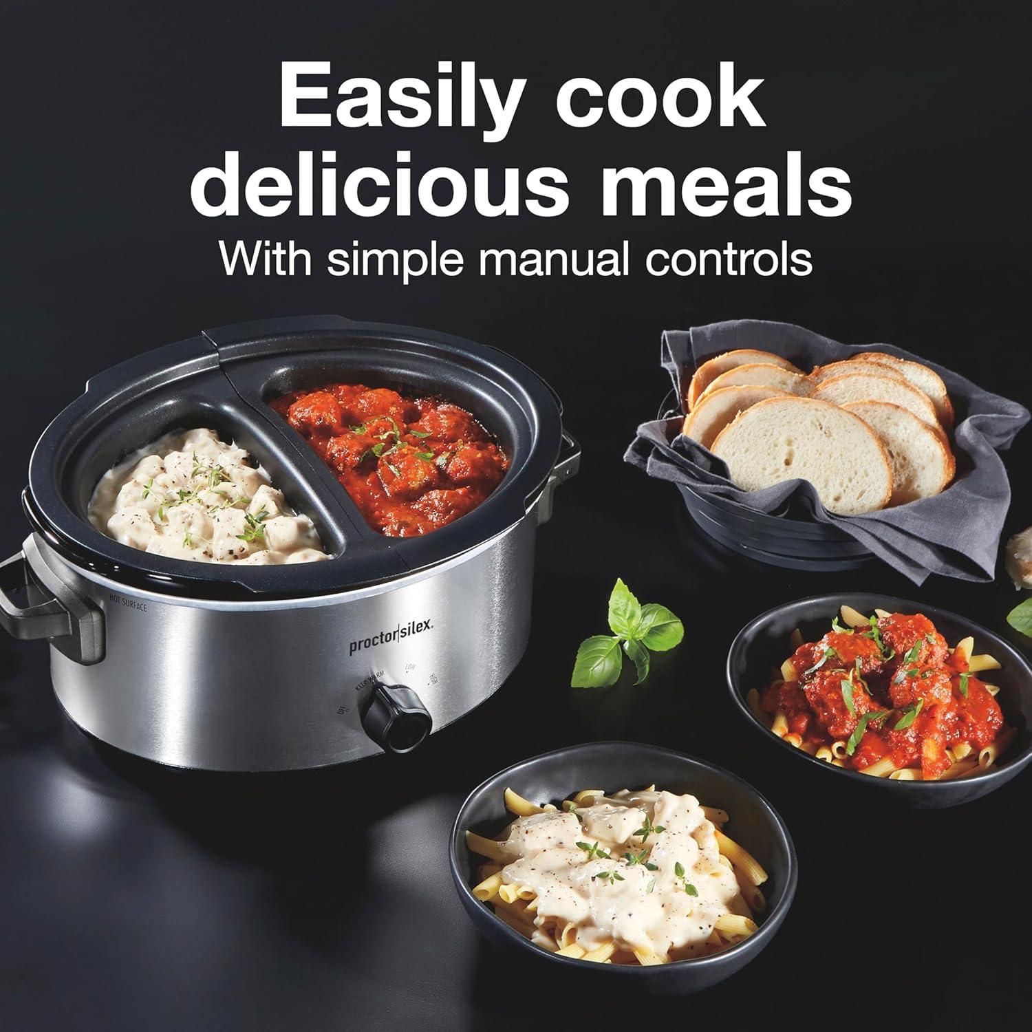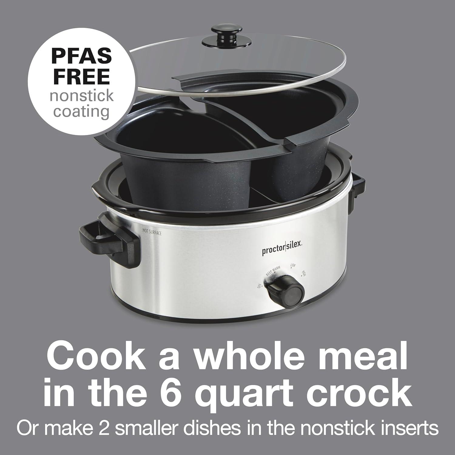 Proctor Silex Double Dish Slow Cooker with 6qt Crock and Dual 2.5qt Nonstick Insert to Cook Two Meals at Once, Dishwasher Safe Pot & Lid, Silver (33563)