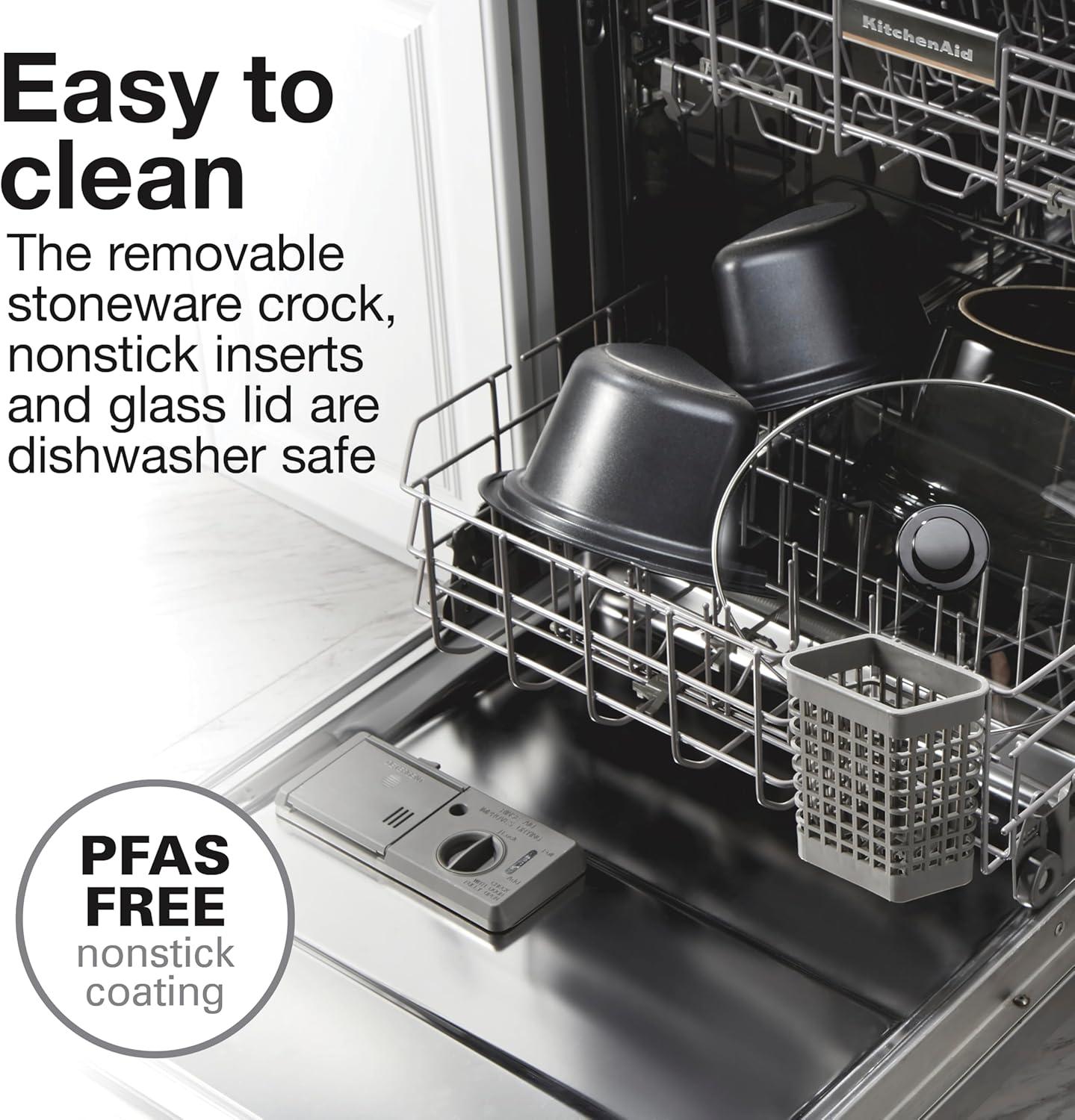 EASY TO CLEAN: The removable stoneware crock, nonstick inserts and glass lid are dishwasher safe and easy to clean. The crock can also be used in the oven or microwave.