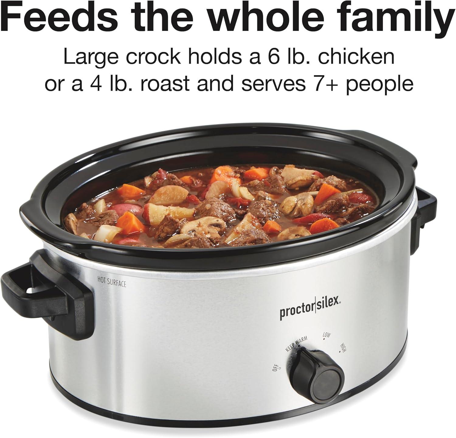 FEEDS THE WHOLE FAMILY: The 6 quart slow cooker has a stoneware crock that's perfect for one-pot meals, meat and poultry. It will hold a 6 lb. chicken or a 4 lb. roast. Serves 7+ people.