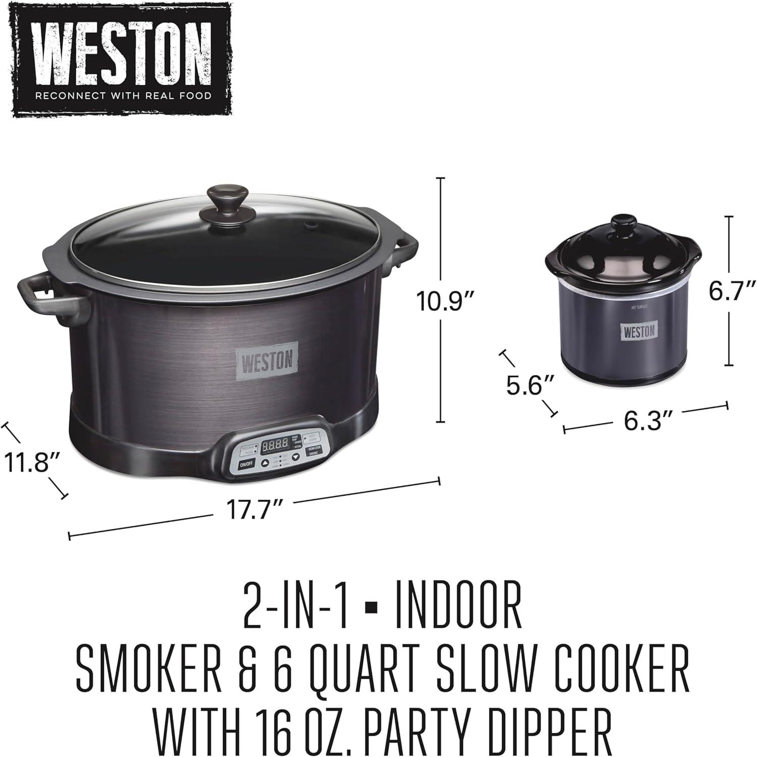WESTON 2-in-1 Programmable Slow Cooker & Electric Indoor Smoker, 6 Quart, 3-Tier Smoking Rack for Meat, Cheese and More, Dishwasher Safe Crock, Temperature Probe, Includes 16 oz. Party Dipper, Black(Black (No Party Dipper))