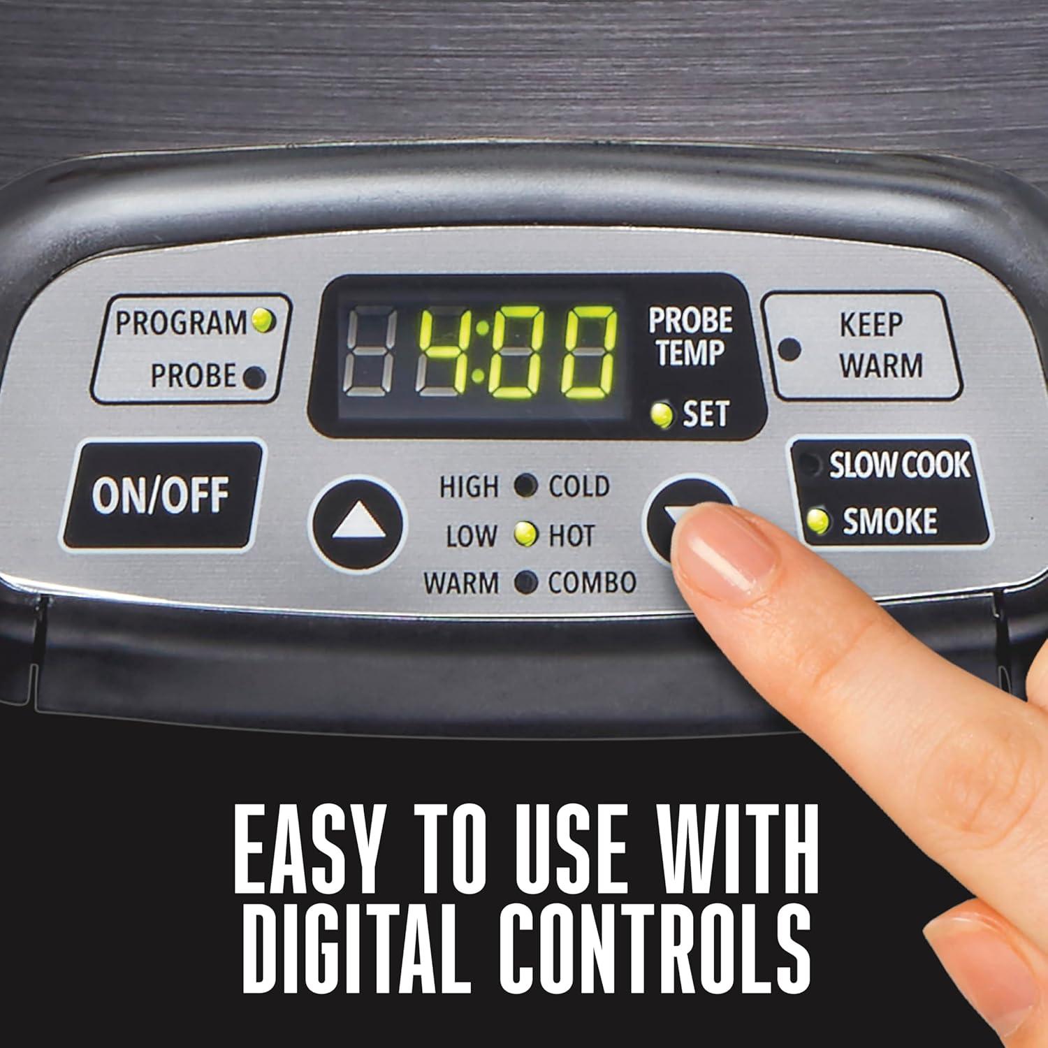 EASY TO USE: The digital controls are simple to use. Choose from 3 smoke settings or slow cook your meal on Low or High. Just set the timer, and the slow cooker automatically switches to Warm when cooking is complete, or it turns off when cold smoking.